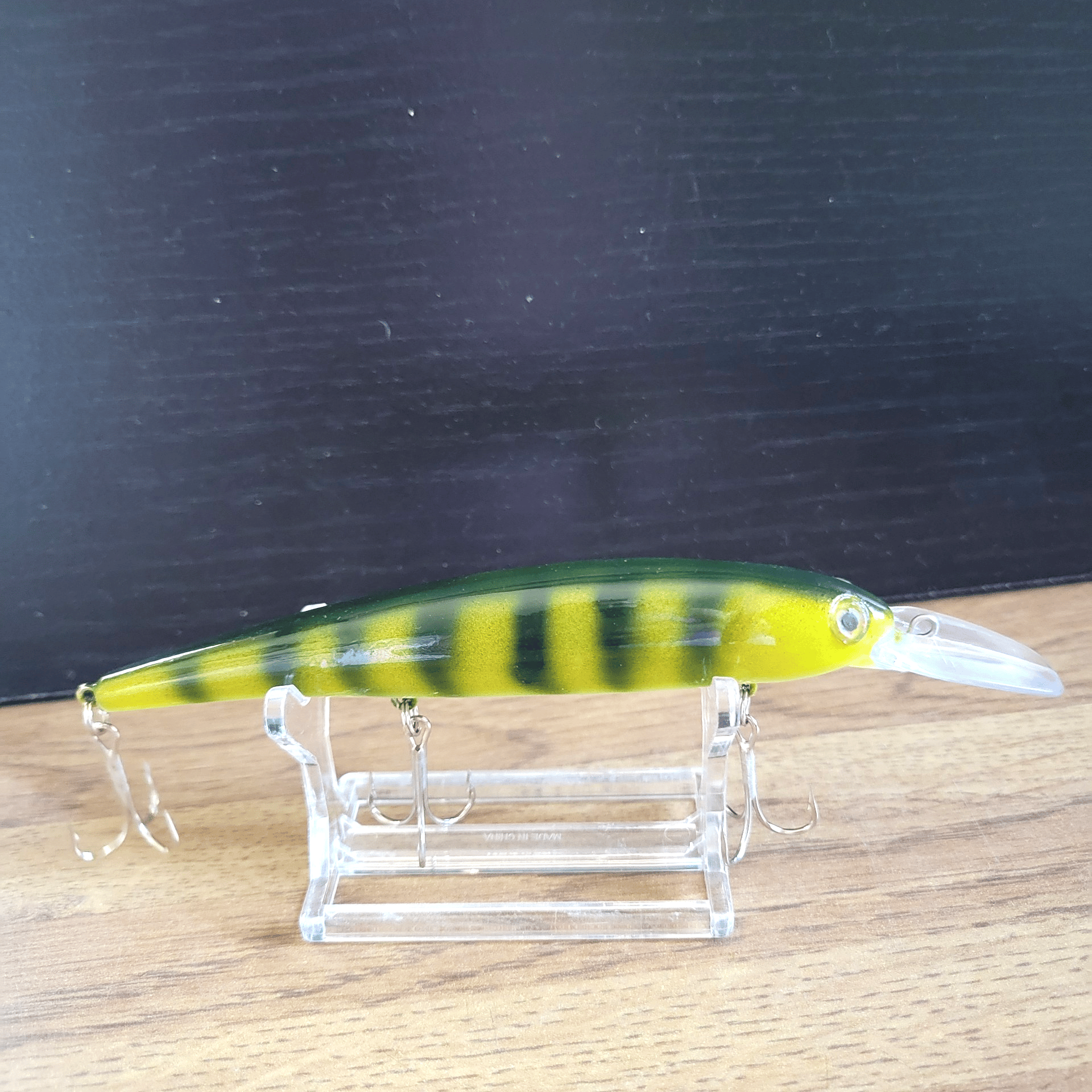 Custom painted, green color shifts to a reddish color. Overall Length is 5 3/4 inches, body is 4.5 inches. We only use KBS Diamond clear coat for a durable finish, on all our spinner blades and crank baits.